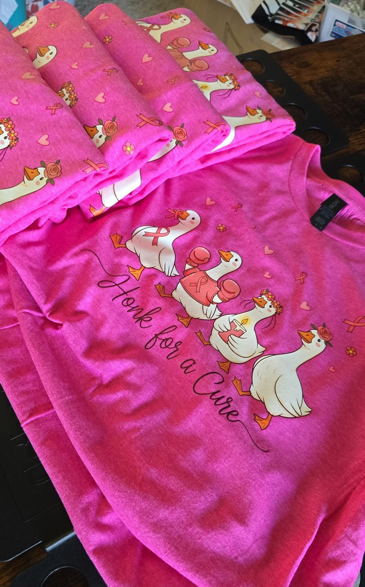 Goose print and breast cancer support all wrapped up in one!! Pressed on Gildan Softstyle heather heliconia tee.